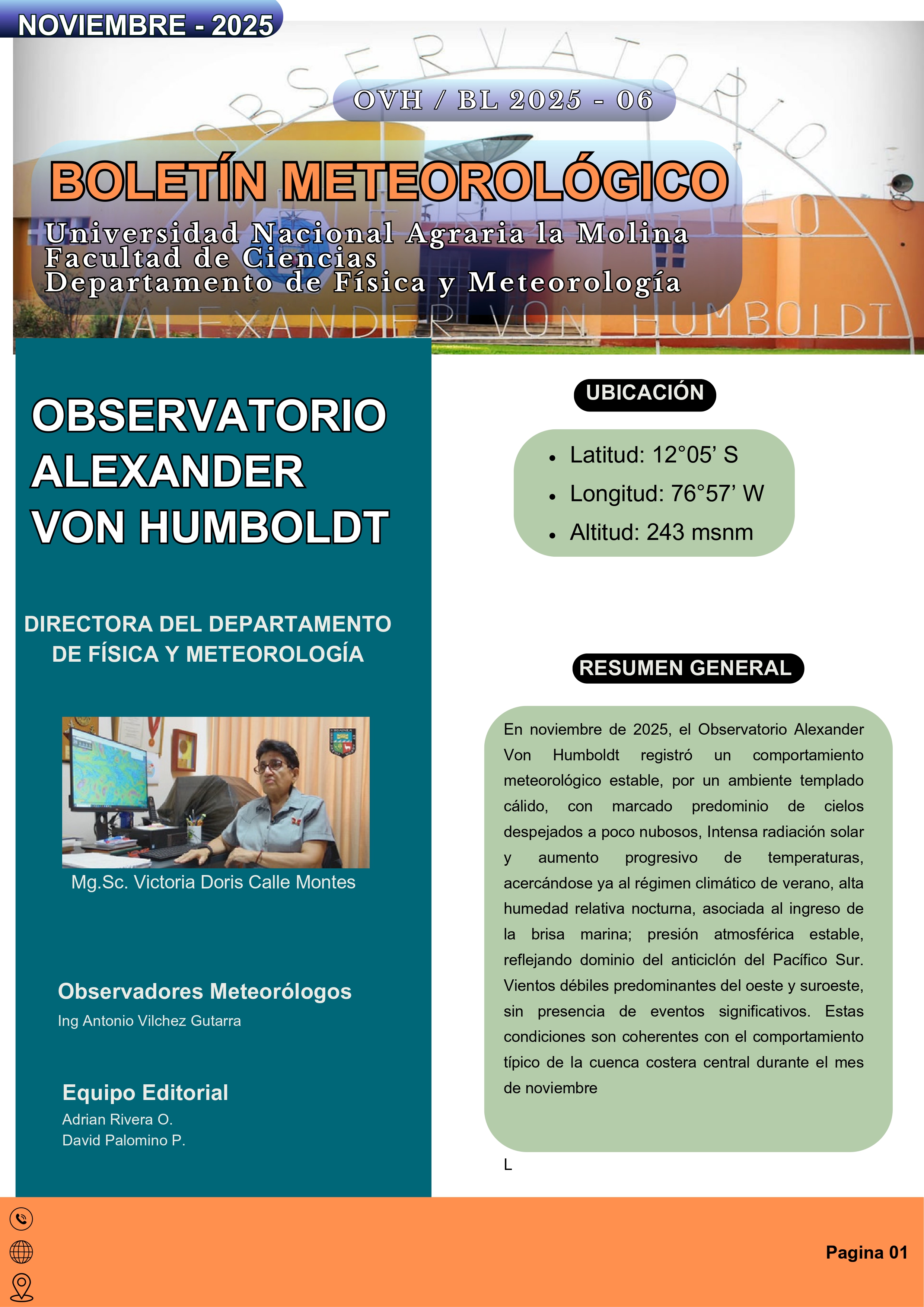 En noviembre de 2025, el Observatorio Alexander Von Humboldt registró un comportamiento meteorológico estable, por un ambiente templado cálido, con marcado predominio de cielos despejados a poco nubosos, intensa radiación solar y aumento progresivo de temperaturas, acercándose ya al régimen climático de verano, alta humedad relativa nocturna, asociada al ingreso de la brisa marina; presión atmosférica estable, reflejando dominio del anticiclón del Pacífico Sur; vientos débiles predominantes del oeste y suroeste, sin presencia de eventos significativos. Estas condiciones son coherentes con el comportamiento típico de la cuenca costera central durante el mes de noviembre